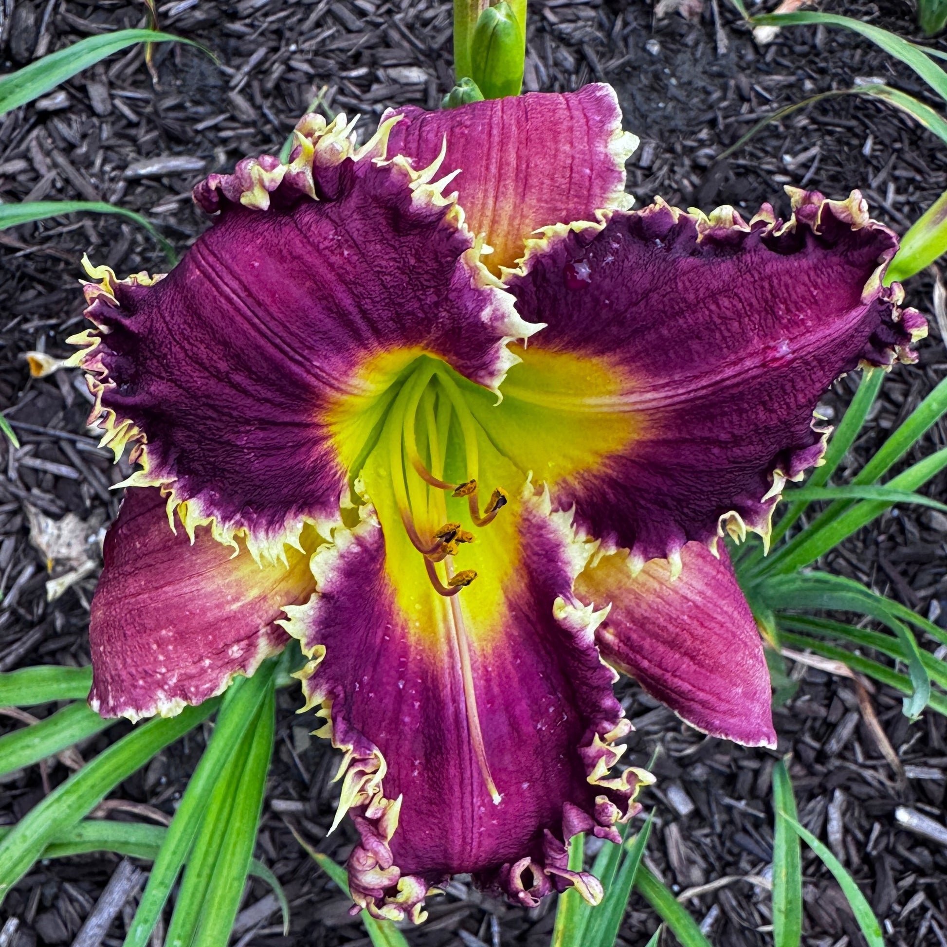 (James Gossard). Dormant tetraploid. Mid-Late, Rebloom. 32″ scape, 6″ bloom. 3–4 way branching, 18–22 buds. Very fertile both ways.
