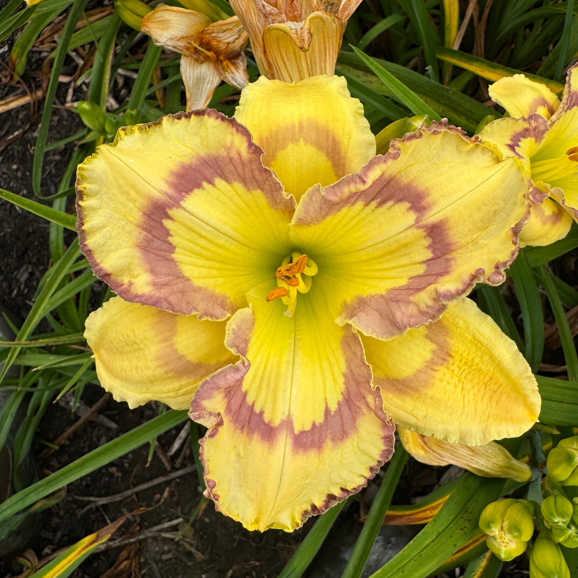 (Stamile–Pierce). Evergreen tetraploid. 35″ scape, 6.25″ bloom. Violet eye and edge on warm cream base extending onto sepals.